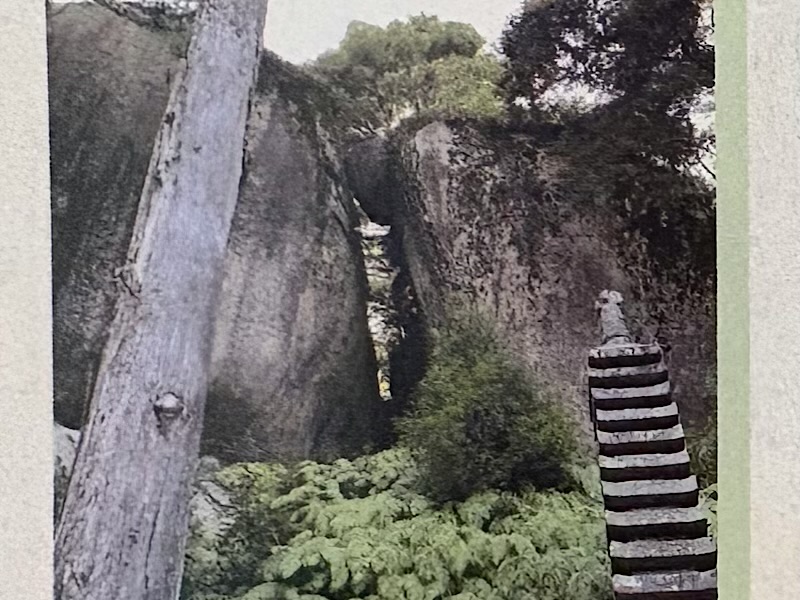 左が先ほどの薬師石、右が文珠石、そして真ん中に挟まっているのが笠置石(かさおきいし)。