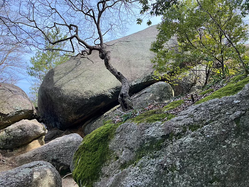 笠置山は古くからの修験道場、信仰の山。花崗岩から成る山中には奇岩や怪石が数多く、神秘的なムードを高めます。