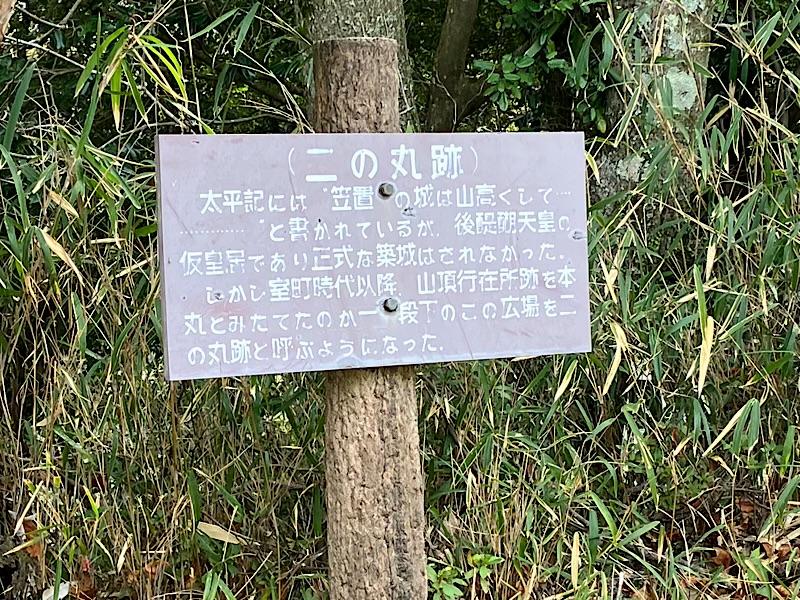 後醍醐天皇の仮皇居ではあったものの築城はされず、山頂の行在所跡を一の丸とし、一段下のこの辺りを二の丸としたそうです。