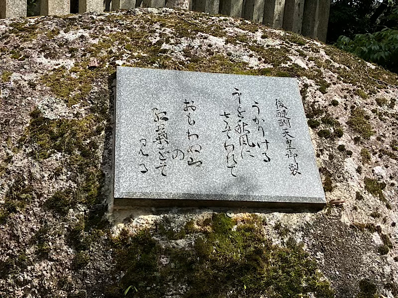 後醍醐天皇の歌碑があります。「うかりける身を秋風にさそわれておもわぬ山の紅葉をぞ見る」都にいる身のはずがまさかこんな地にいるとはと我が身を悲しみ詠まれたのでしょうか。。?