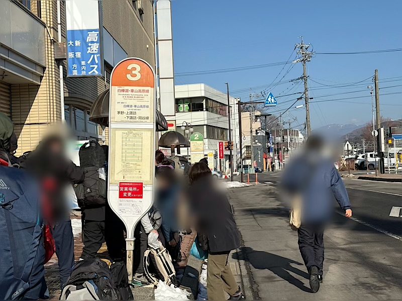 この前の2番が北八ヶ岳ロープウェイ行のバス停です。圧倒的にこちらに行かれる登山者が多いので、そちらに並ぶ時も確実にあずさ到着前に、をおススメします。