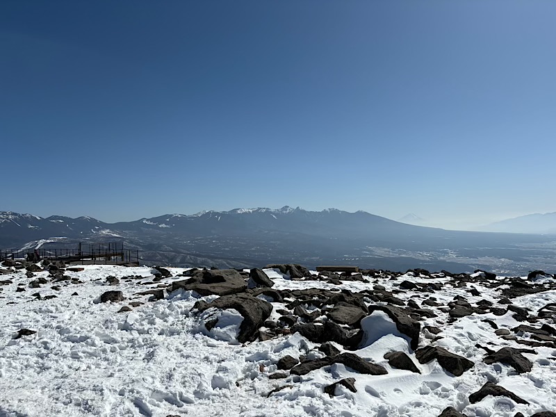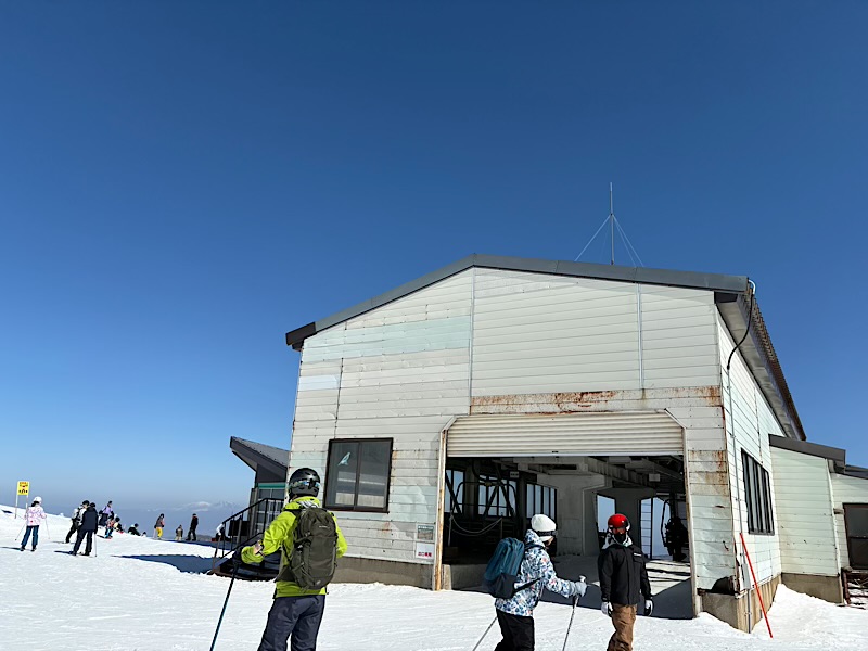 リフト小屋の後ろには蓼科山、横岳と山並みが続きます。