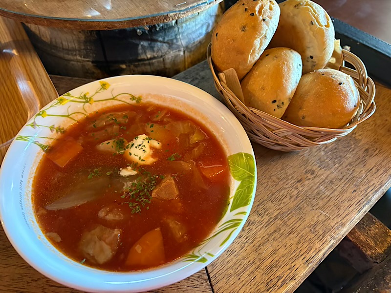 やっぱりここに来たら、ボルシチですね。(写真のパンは2人分です)