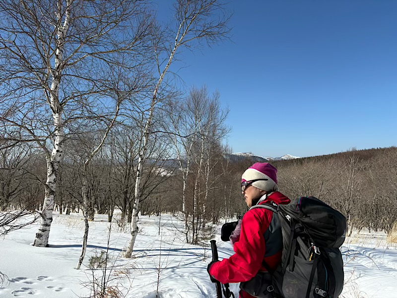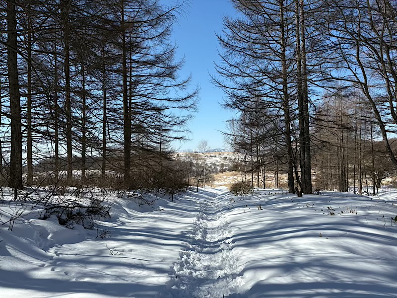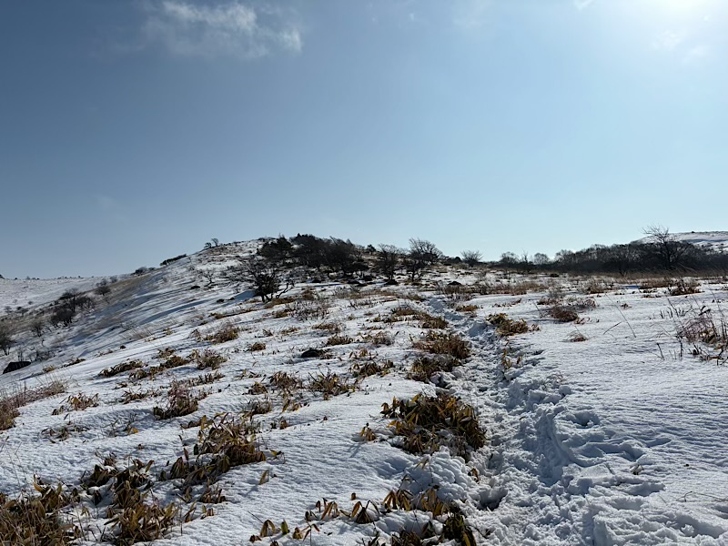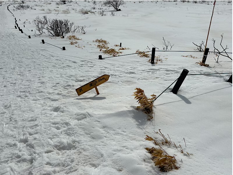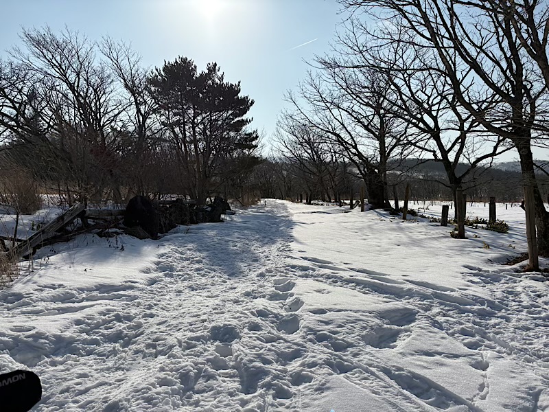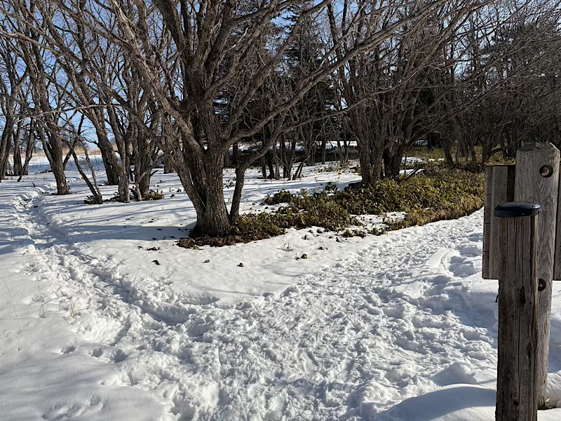 この先に湿原がありますが、雪のシーズンは分かりにくく間違って入り込んだトレースがあるとその後に続く人が誤ってまた入り込んでしまいます。湿原に入り込まないよう気を付けないといけないですね。