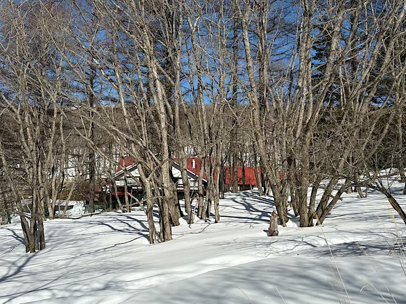 因みにこちらはグリーンシーズンの写真。左上の観測所からこの森の中の赤い屋根の小屋を目指し今斜面を下りてきている感じです。