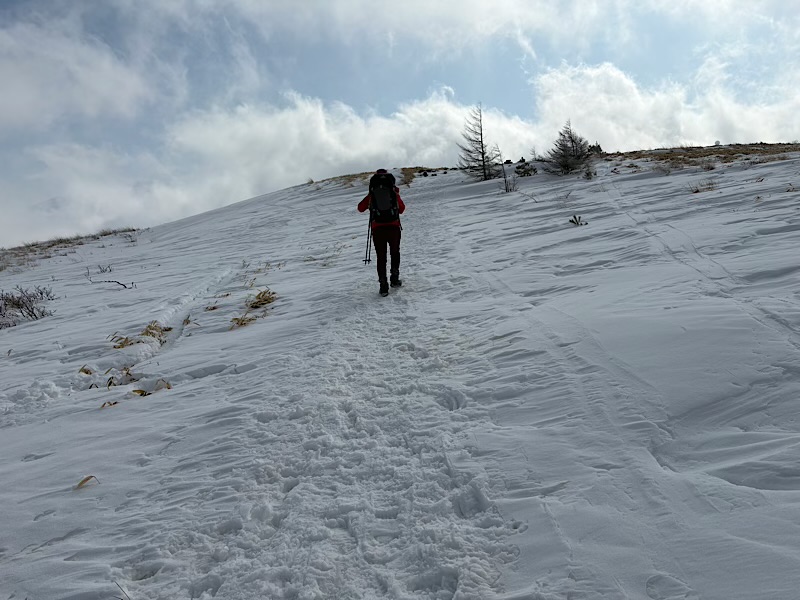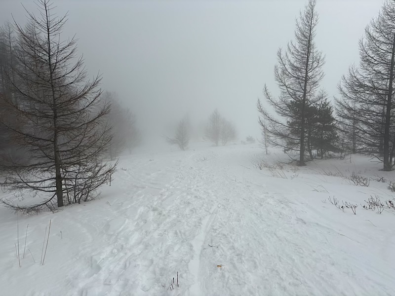 スキー場のコースに入らないように、登山者のトレースの上を歩き始めましたが、だんだん視界が悪くなり。。