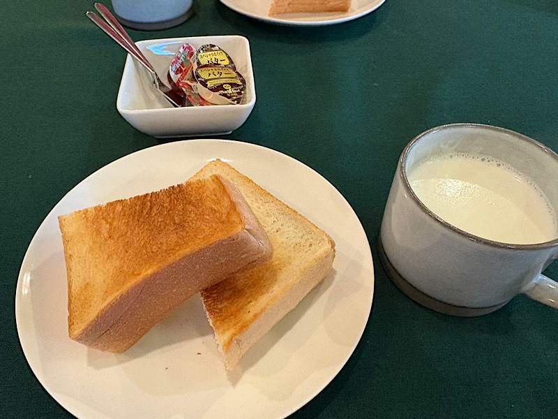 朝はトーストとドリンク(コーヒー、ミルク、ジュース等選べます)。足りない人はサラダ等持ち込みOKだそうです。美味しい食パンでした。