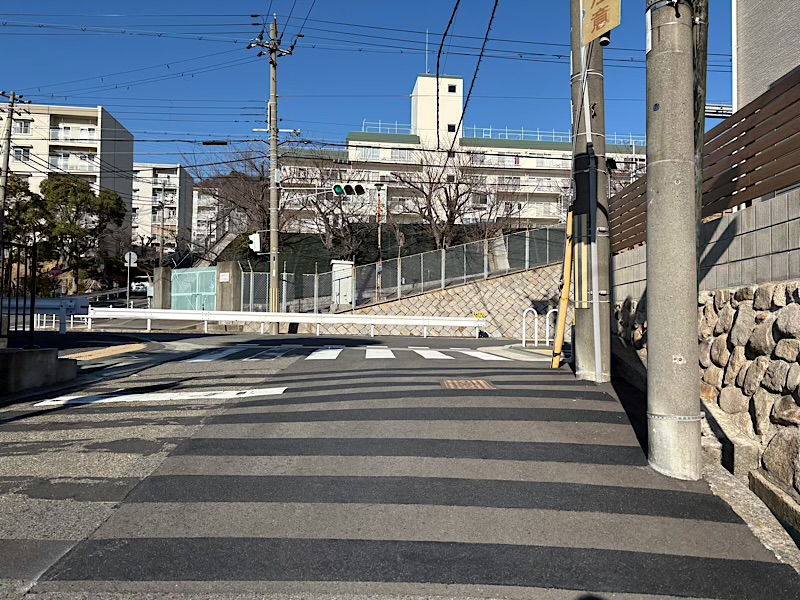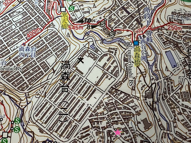 黒・赤どちらからでも上がると、この渦森台の団地前の道に出ます。ここを右へ。
