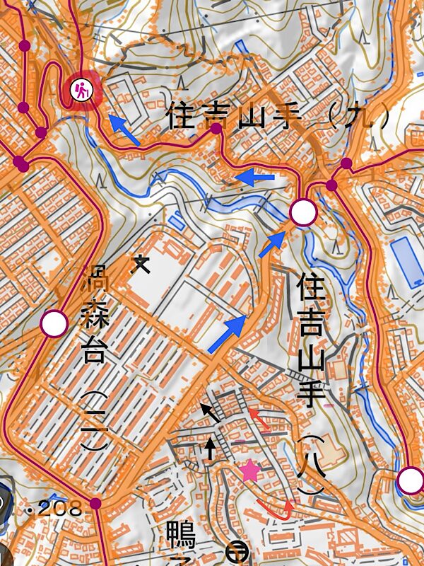 ピンクの星印のバス停から私は赤ののように一度下って上がったのですが、改めて地図を見るとバス停から戻って黒の→のように連続階段からの道の方が近かったようです。