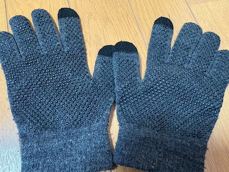 ダイソーのタッチ手袋。100円でグリップがついて、スマホの操作も問題なく付けたままサクサク操作できます!