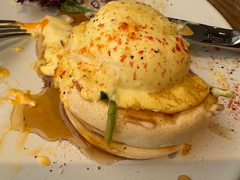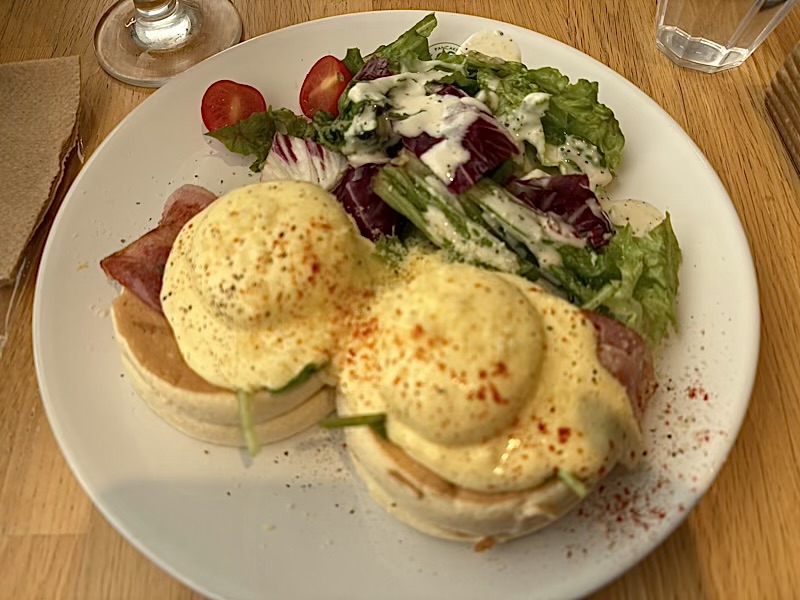 半分にしたイングリッシュマフィンの上にベーコンやハム、ポーチドエッグをのせて、オランデーズソースをかけたもの。オランデーズソースはマヨネーズに近い感じ?ですがフランス料理の基本ソースの一つだそうです。