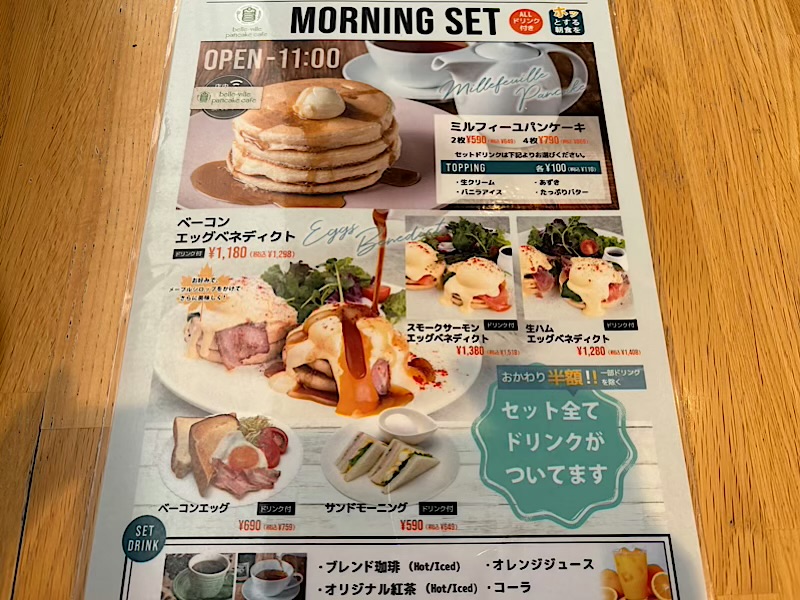 下山後にランチもいいですが、パンケーキ2枚にドリンクセット等のモーニングを食べてから出発もおススメです。